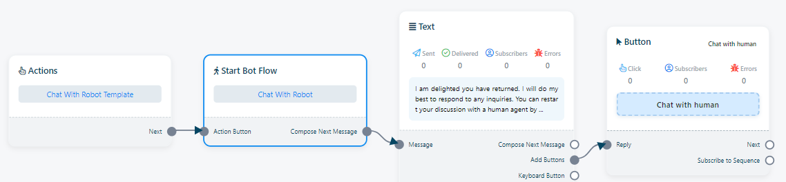 Chat With Bot: `Chat with Bot` typically signifies the continuation of a conversation with the automated chatbot itself, without transitioning to a human agent. It implies that the user prefers to persist in interacting with the chatbot to obtain information, assistance, or accomplish tasks within the capabilities of the automated system.